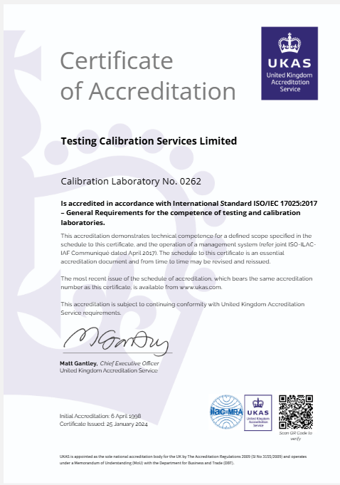 Testing Calibration Services holds UKAS Accreditation for the calibration of metals to BS EN ISO 9513 and ASTM E83.